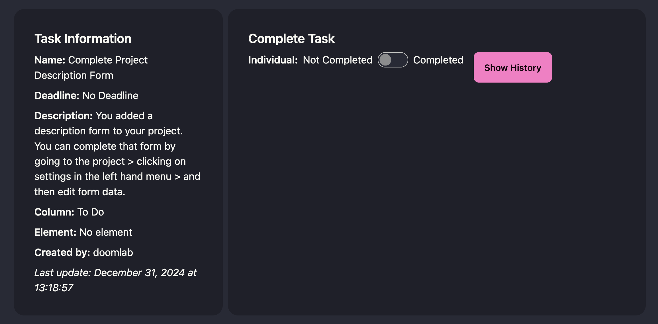 If you add a form when you create a new project, you will get an automatic task reminding you to fill it out: