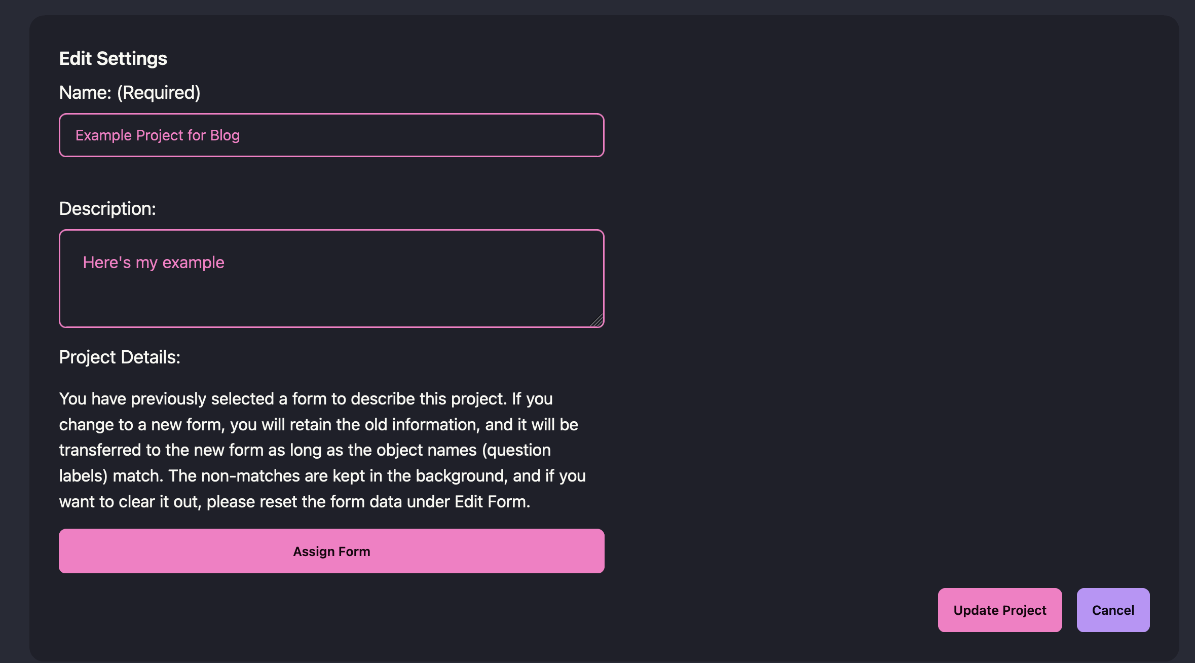 So, if you change metadata forms and the “object name” is the same –> it will keep the data for you. That means that if you change the form and then go to edit project form data, you will see anything that matches with labels. What does that mean? Let’s look at forms: